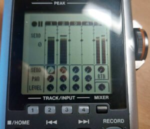 Im Unterschied dazu nimmt man im Multitrackmodus die Spuren nacheinander auf. Das ist für Musiker interssant, die zum Beispiel auf Spur 1 eine Gitarre aufnehmen, auf Spur zwei gleichzeitig eine Gesangsstimme. Dann wird gestoppt und auf Spur drei ein weiteres Instrument aufgezeichnet, wobei die Spuren 1 und 2 gleichzeitig über Kopfhörer wiedergegeben werden sodass man dazu im Rythmus spielen kann. Die Mixerfunktion erlaubt es dabei die Lautstärken anzupassen. Möglich ist es auch einen Delay/Reverb.-Effekt mit einzubinden. Ich finde das Verfahren nicht sehr komfortabel und habe es nicht bis zum Ende ausprobiert! Es gibt dafür wesentlich komfortablere Geräte für Musiker, aber wenn man möglichst mobil sein möchte ist der kleine Tascam eine Überlegung wert.