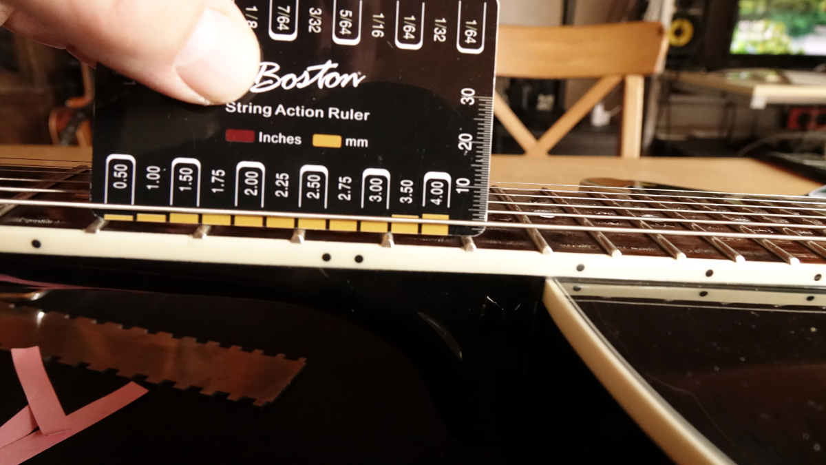 Saiten runter, Hals leicht nachgestellt bis er gerade war. Bünde mit dem „Fretrocker“ (ein Metallstück mit unterschiedlichen Kantenlängen, den man über drei Bünde anlegt. Ist der mittlere zu hoch, dann wackelt das Teil) getestet und 5. und 7. Bundstab mit Filzstift markiert. Den „Fretleveler“ (eine etwas breitere und längere Metall-Feile) ein paarmal drübergezogen. Mit dem Fretrocker überprüft, mit der Crowning-Feile wieder abgerundet und anschließend mit Metallwolle poliert. Saiten wieder drauf und das erste Problem ist gelöst.