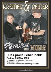 Kreiner & Reiner spielen ihr Programm „Des pralle Leben hald“ – Märchen und Musik im wunderschönen alten Kino „Capitol“ in Sulzbach Rosenberg. Veranstalter ist der Hospizverein Amberg und Landkreis Amberg-Sulzbach e.V.